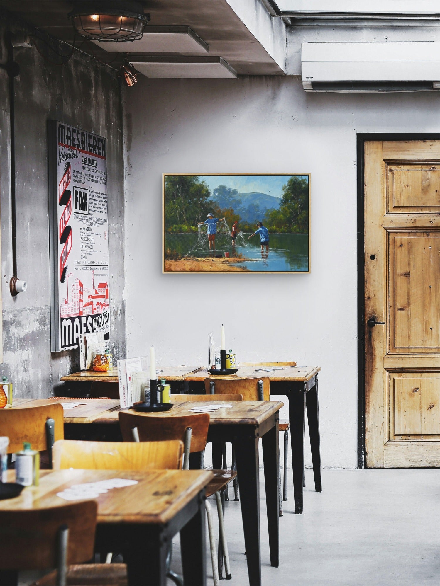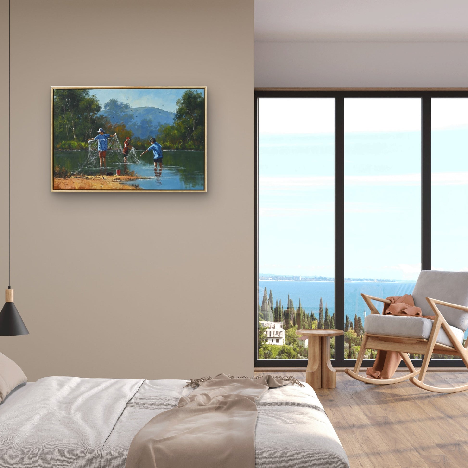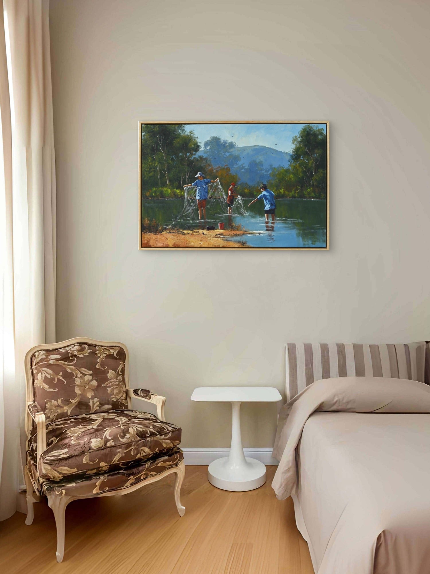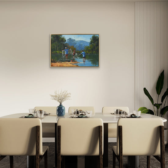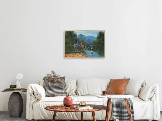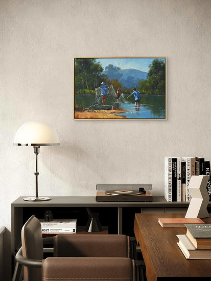 Utilizing the rich, vibrant textures of oil on canvas, Moore employs a masterful technique that captures the shimmering reflection of water and the warmth of sunlight filtering through the trees. His brushwork is deliberate yet fluid, creating a dynamic interplay of light and shadow that breathes life into the scene. The meticulous attention to detail, from the expressions of the boys to the gentle ripples of the creek, showcases Moore's commitment to quality and his emerging status among serious collectors on a global scale.