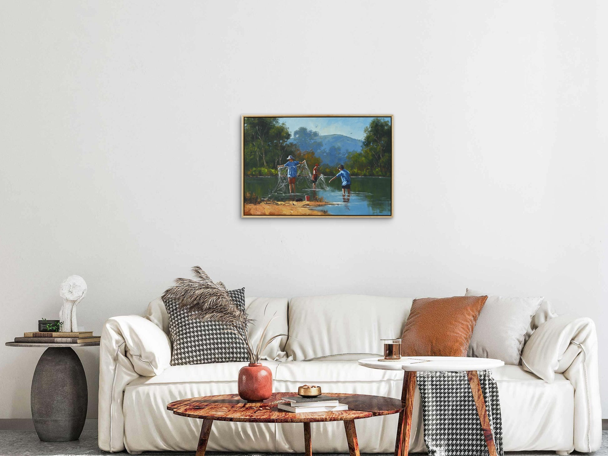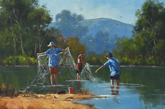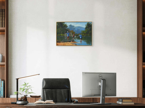 In "Tangled Web We Weave," Rod Moore masterfully captures a moment steeped in nostalgia, inviting viewers to reflect on the innocence of youth and the uncomplicated joys of simpler times. The artwork depicts three young lads entangled in their fishing lines at a local creek, a scene brimming with both playful mischief and a sense of camaraderie.